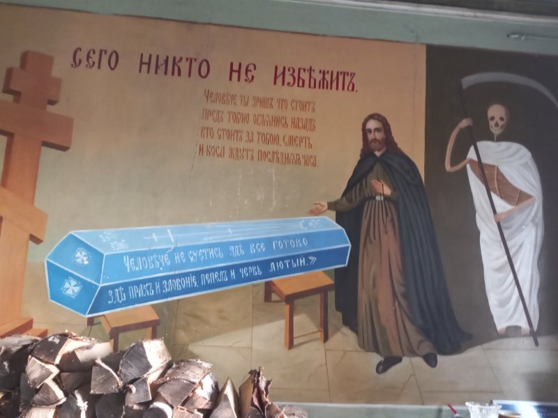 В притворе храма – роспись на стене: «Сего никто не избежит». Далее: «Человече, ты зришь, что стоит пред тобою, оглянись назад, кто стоит за тобою: смерть и коса ждут последнего часа…» На гробе же написано: «Человече, не суетись: здесь все готово. Здесь прах и зловоние, пепел и червь лютый.» Эта картина о памяти смертной висела на стене у кровати старца Николая Гурьянова.