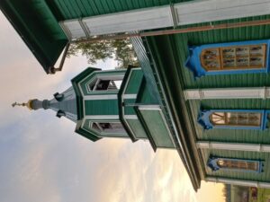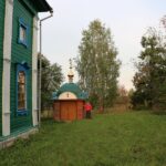 Зеленый деревянный храм, окружённый ветвистыми деревьями, стоит на самом въезде. Перед ним – просторная поляна, с которой начинается сельская улица. И первым на этой улице стоит двухэтажный, дореволюционной постройки дом. С просторной оградой и большим огородом. Здесь и располагается монастырское подворье.