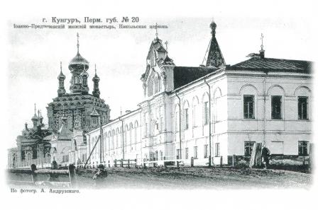 «Третий корпус монастыря, идущий от второго на 12 саженей, был построен в 1869 году Алексеем Сем. Губкиным под приют для помещения девочек-сирот кунгурских граждан. В 1883 году в нижнем этаже этого корпуса устроено свечное заведение».